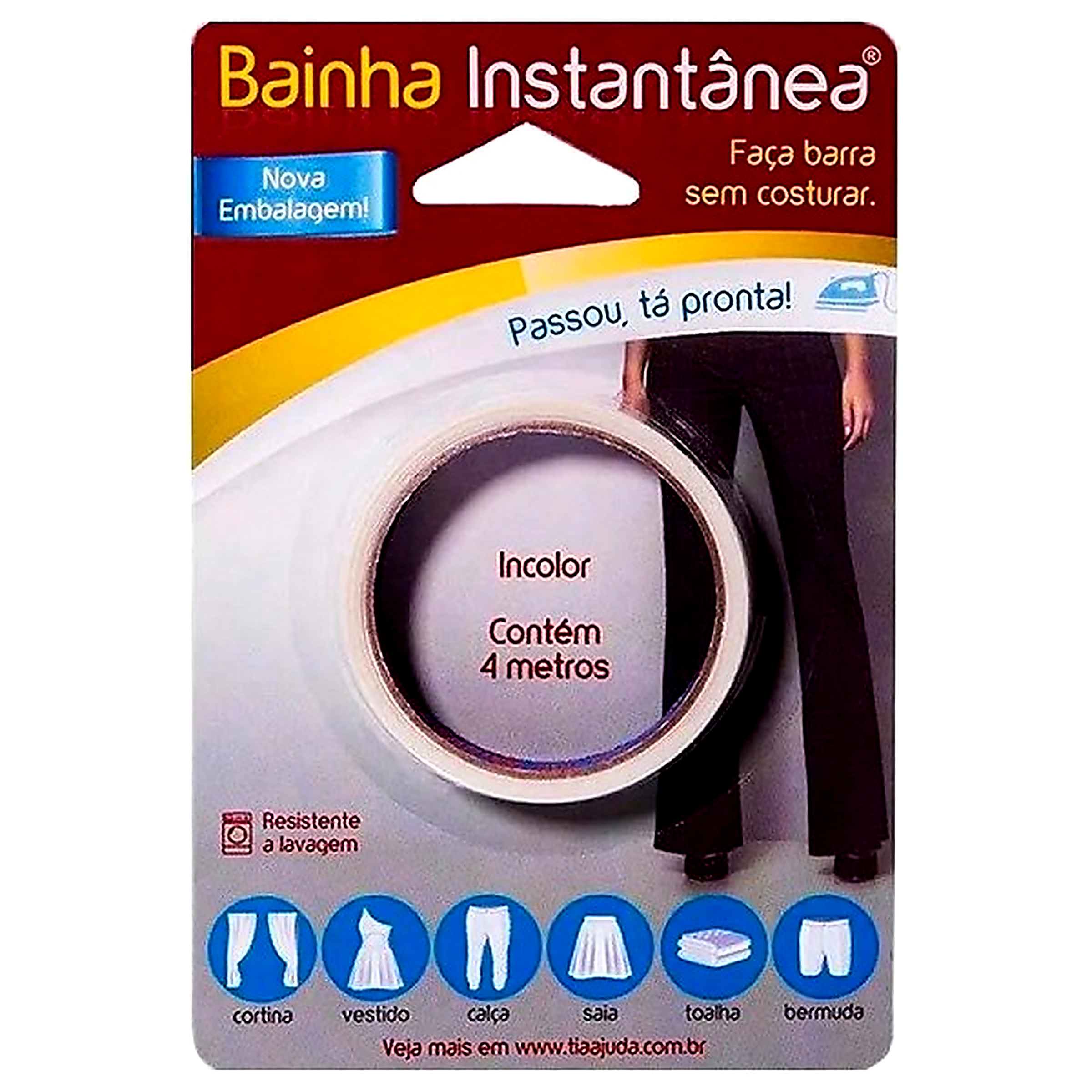 A Bainha Instantânea Tia Ajuda é uma fita termocolante prática que permite fazer barras em roupas sem necessidade de costura. Com aplicação simples utilizando ferro de passar, fixa o tecido de forma rápida e segura, proporcionando acabamento discreto e resistente.