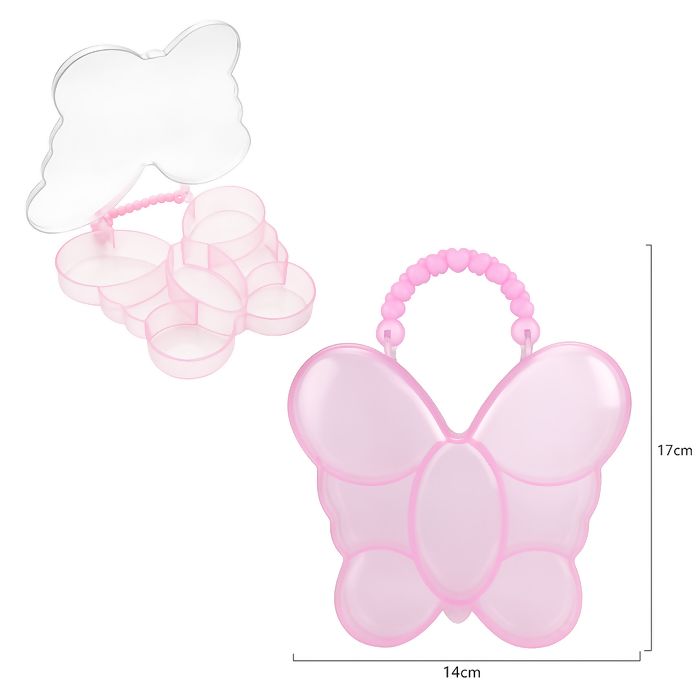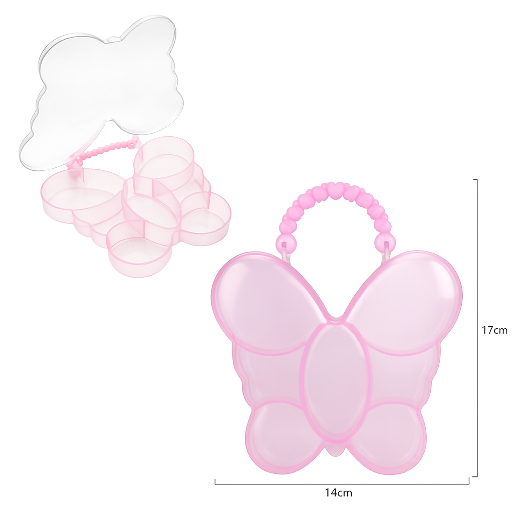 A Caixa Organizadora Borboleta é um item de armazenamento compacto e prático, ideal para guardar e organizar materiais pequenos, como pérolas, botões, linhas e alfinetes. A caixa é feita de plástico rosa e tem um formato de borboleta.