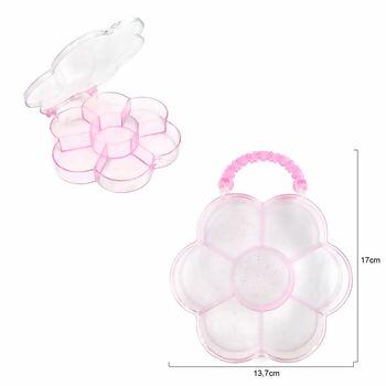 A Caixa Organizadora Flor é um item de armazenamento compacto e prático, ideal para guardar e organizar materiais pequenos, como pérolas, botões, linhas e alfinetes. A caixa é feita de plástico rosa e tem um formato de flor.