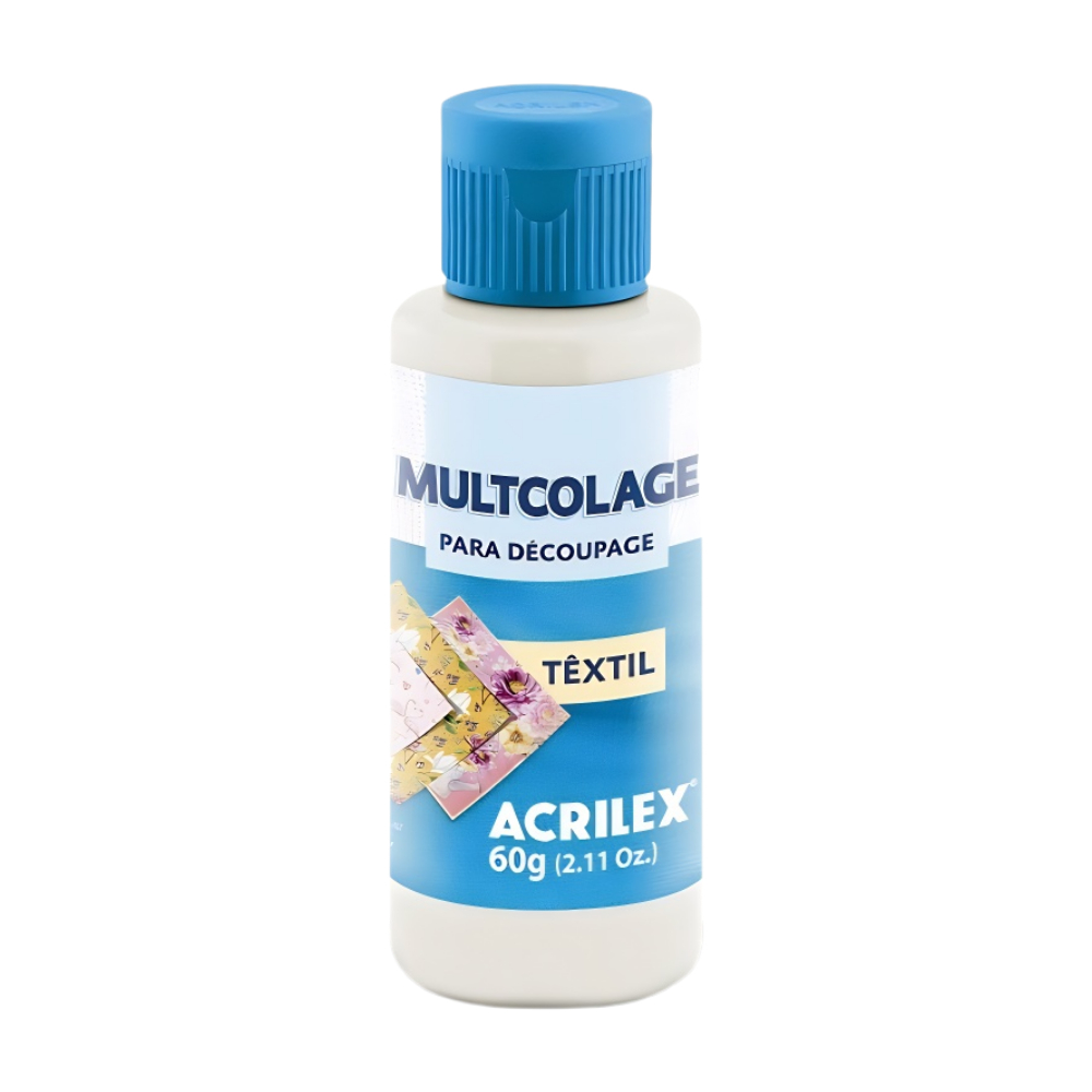 Aplique com pincel ou esponja na superfície, cole o papel, alise e aplique novamente uma camada de Multcolage Têxtil sobre a découpage.