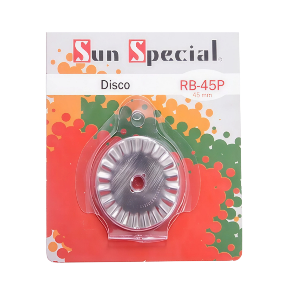 O disco cortador circular Sun Special RB-45P é ideal para uso em patchwork, costura e artesanato. Com lâmina de 45mm no formato ondas, proporciona cortes decorativos precisos e diferenciados em tecidos, papéis e outros materiais, facilitando a criação de acabamentos exclusivos.