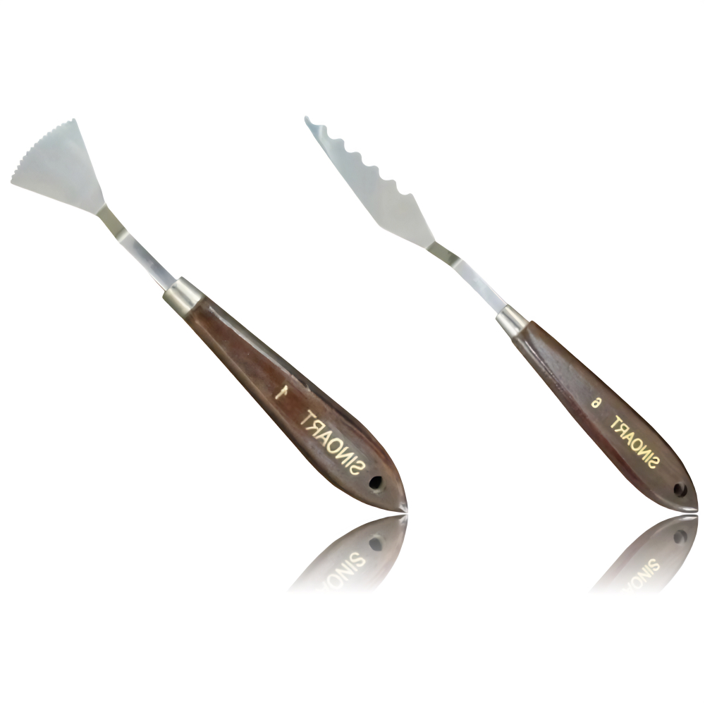Espátula de pintura Sinoart para efeitos decorativos. Produzida em aço especialmente muito flexível e cabo de madeira dura. Esta espátula permite o desenvolvimento das mais diversas técnicas de pintura artística a óleo, acrílica, guache e outras técnicas. Diferentemente da espátula plástica, esta espátula é altamente flexível, o que proporciona na pintura efeitos incríveis.