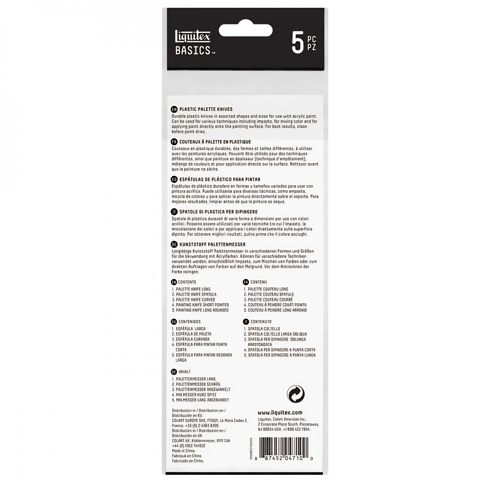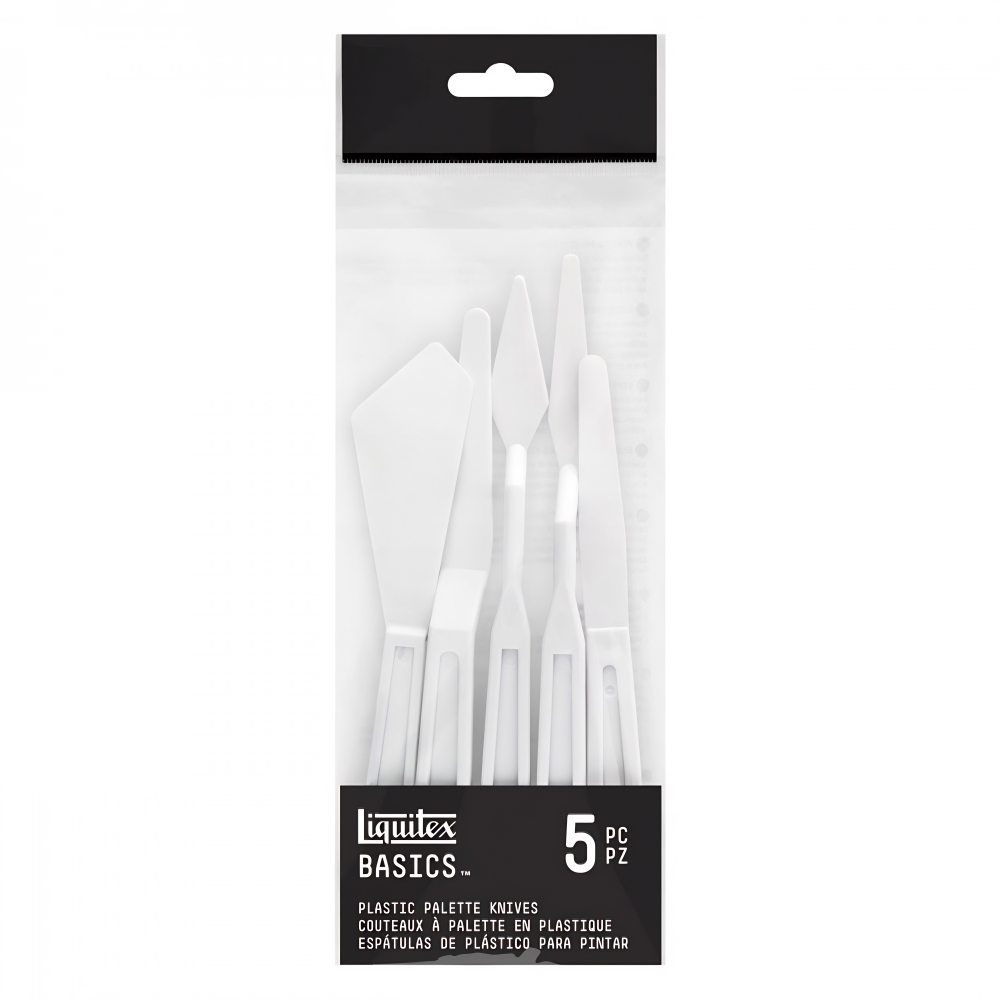 Conjunto com 5 espátulas plásticas para pintura Liquitex, em tamanhos e formatos elaborados para melhor atender as necessidades do artista. Leve e com alta elasticidade, durável em todas as técnicas de pintura.