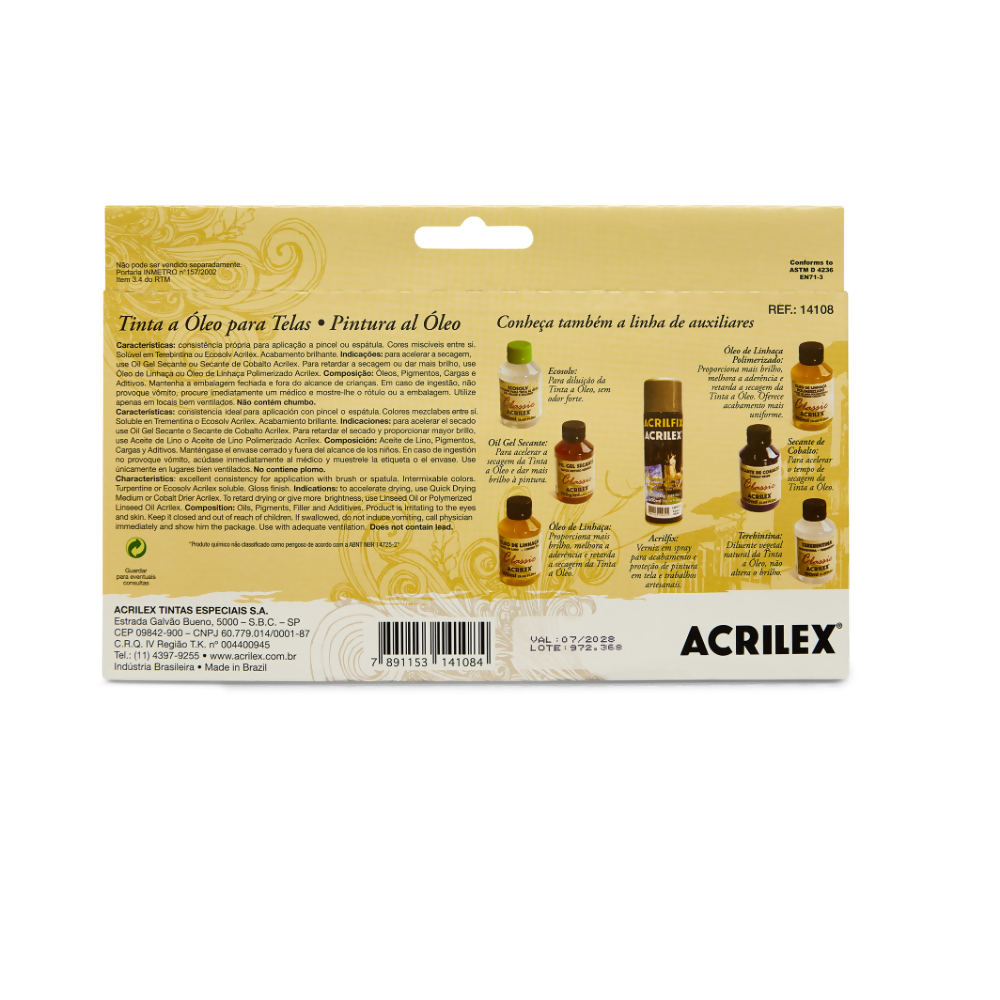 O Estojo de Tinta a Óleo Classic Colors da Acrilex traz 8 bisnagas de 20 ml cada, oferecendo um conjunto versátil e completo para artistas — ideal tanto para estudantes quanto para quem busca praticidade e qualidade em trabalhos artísticos, ilustrações, retratos, paisagens e pinturas em telas ou madeira. Com cores intensas e acabamento clássico, a tinta óleo Classic Colors permite mistura fácil, transparência e cobertura uniforme, proporcionando resultados expressivos e duradouros