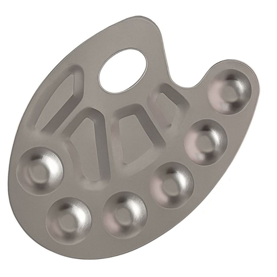 Informação: Godê paleta em alumínio, indicado para mistura e organização de tintas, 6 cavidades e 4 áreas de mistura.