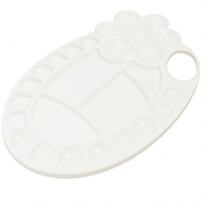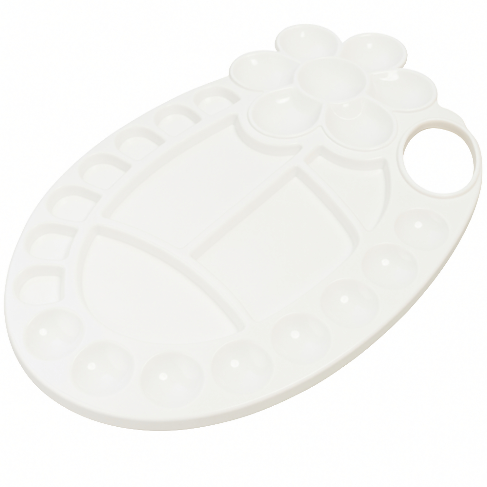 Possui 26 escaninhos para armazenar a tinta e espaço para mistura das cores.