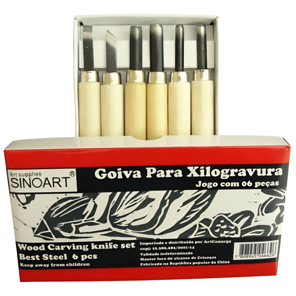 Conjunto com 06 goivas para xilogravura Sinoart. Formatos: corte reto, corte chanfrado, "V" grande, "V" pequeno, "U" grande, "U" pequeno. Este conjunto de goiva para xilo Sinoart possui os formatos ideais para iniciantes e universitários.