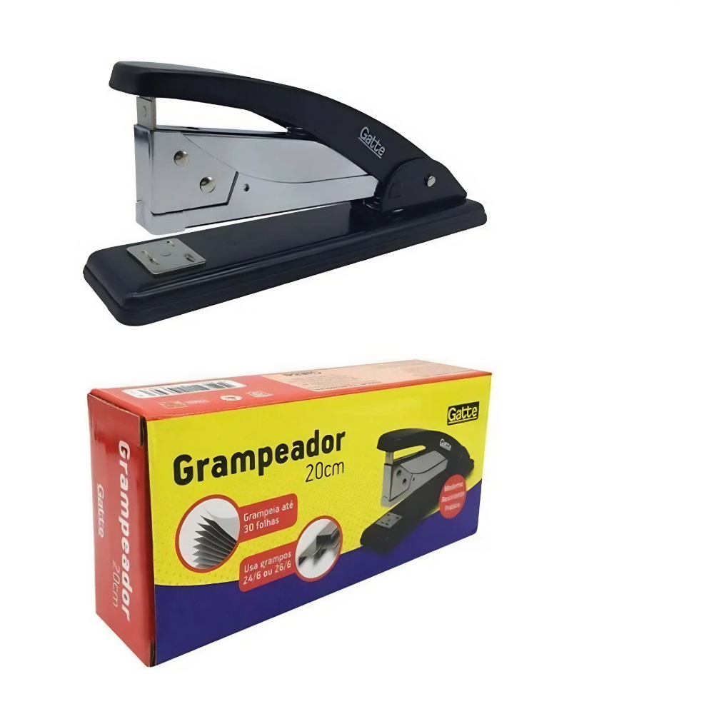 Resistente e prático, o grampeador de metal Gatte usa grampos 24/6 ou 26/6 , possui 20cm e capacidade para grampear até 30 folhas de uma só vez. Ideal para escritório, escola e uso diário, garante eficiência e durabilidade.
