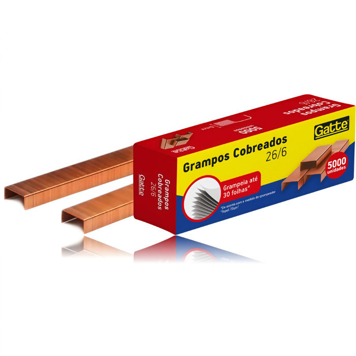 O grampo 26/6 Gatte é ideal para uso em grampeadores manuais ou de mesa, garantindo praticidade e firmeza no grampeamento de papéis em ambientes de escritório, escola ou uso doméstico. Possui acabamento cobreado que oferece maior resistência à oxidação e durabilidade.