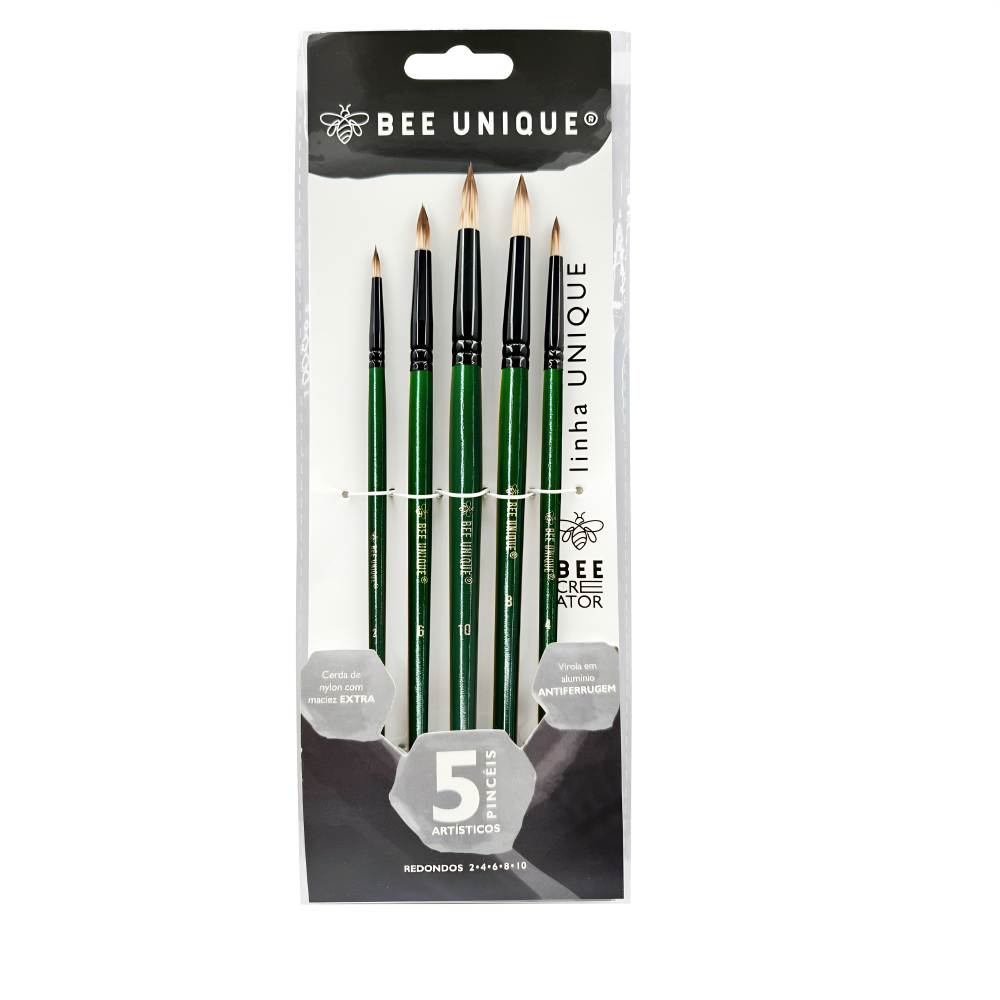 O Kit Pincéis Redondos Bee Unique - Linha Unique é ideal para trabalhos que exigem traços precisos, contornos delicados e detalhes refinados. Com 5 pincéis nos tamanhos 2, 4, 6, 8 e 10, este kit atende tanto iniciantes quanto artistas experientes.