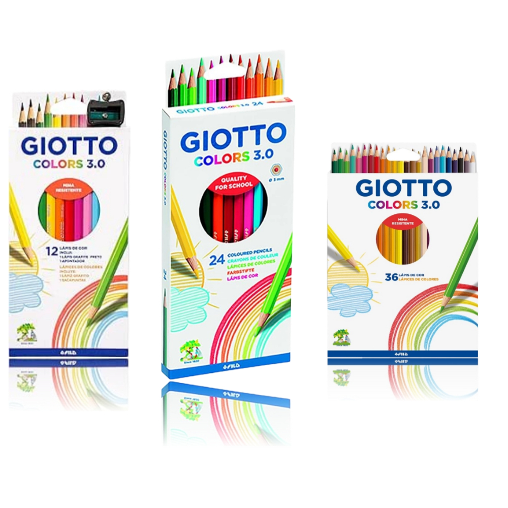 Lápis de cor Giotto® fabricados em madeira de alta qualidade. Corpo hexagonal com Ø 6,8 mm e mina Ø 3,0 mm de diâmetro. Cores vivas e intensas, ideais para uso na escola primária. Corpo lacado na cor da mina com espaço para escrever o nome.