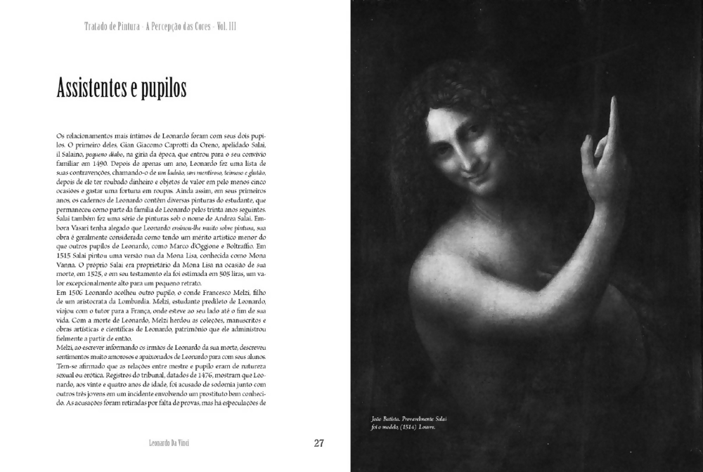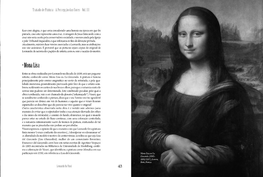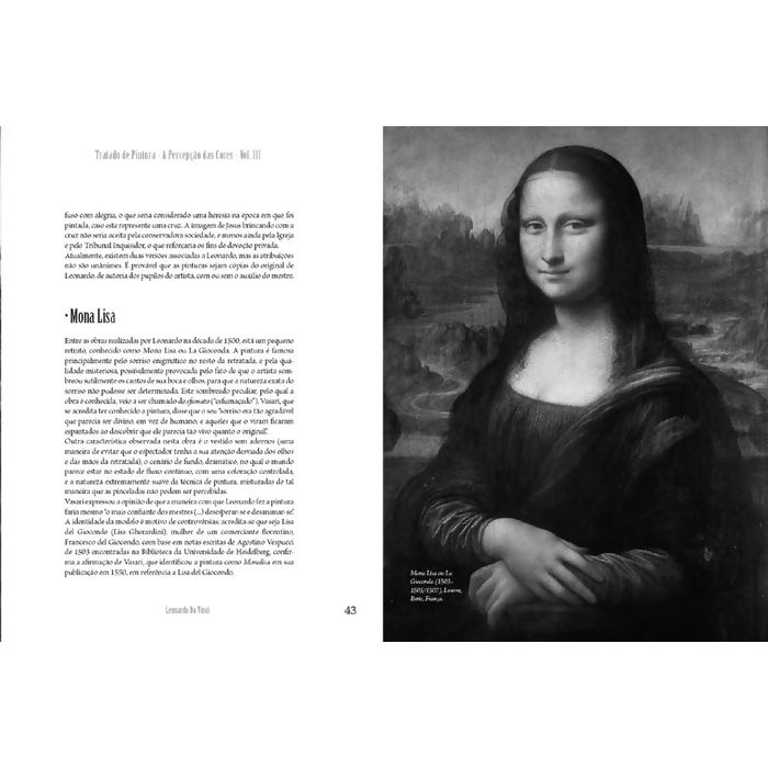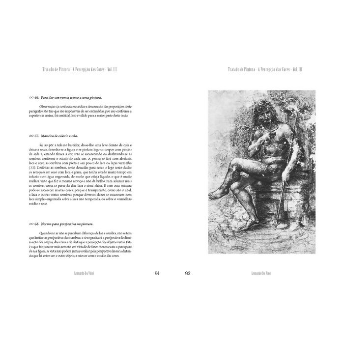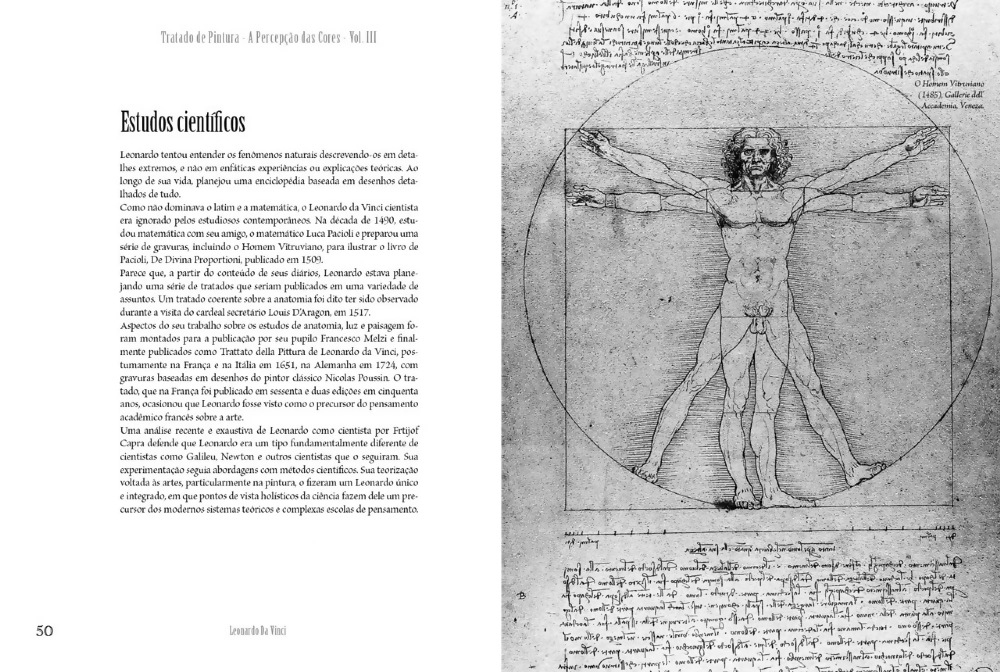 Editado originalmente em 1651, o Tratado de Pintura de Leonardo da Vinci é o mais famoso livro sobre técnicas de arte do mundo e finalmente está disponível em língua portuguesa. Reunido em três belíssimos volumes, o Tratado de Leonardo traz centenas de preceitos que tratam dos mais significativos e expressivos métodos, técnicas e conceitos sobre pintura e desenho. Aqui você aprenderá com o próprio Leonardo. Ao todo são quase 300 páginas e perto de 400 preceitos que versam sobre variados temas da arte como: desenho, pintura, perspectiva, anatomia, cor composição, natureza, luz e sombra, além de conceitos filosóficos e estéticos.