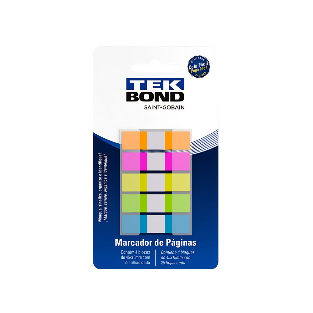 Os Marcadores de Páginas Adesivos da Tekbond são a solução ideal para quem precisa organizar informações, destacar trechos importantes e acessar conteúdos com rapidez, com 5 Cores (45x12mm) são perfeitos para marcar páginas de livros, separar documentos, organizar anotações e tornar o dia a dia mais produtivo.