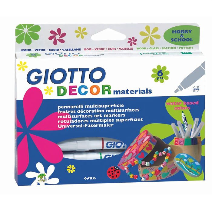 Marcadores Decor Materials GIOTTO c/ 6 coresUma abordagem criativa para tudo, que resiste ao teste do tempo e transforma os seus bens, graças aos marcadores multi-superfícies Giotto Decor Materiais.