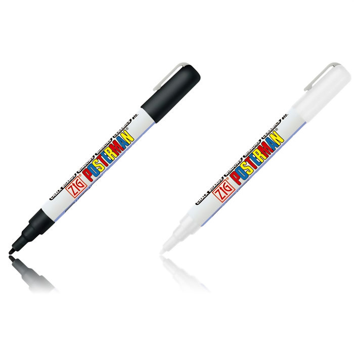 Madeira, Tela, Metal, Plástico, Couro, Cerâmica, Papel, Papelão, Foam Board, Vidro entre outras superfícies, o marcador Zig Posterman é multi uso, confiável que auxilia o artista na criação e execução do seu trabalho.