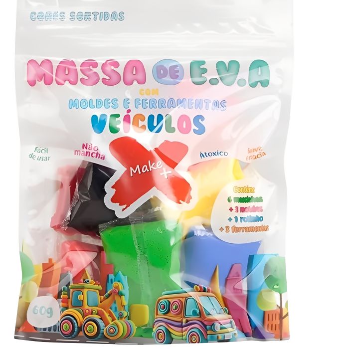 O Kit Massa de EVA Make+ — Tema “Veículos” (60 g) oferece diversão criativa por meio de modelagem prática e temática. Perfeito para projetinhos escolares e momentos em família, esse kit inclui massa leve, macia e de fácil modelagem, além de moldes e ferramentas com formato de veículos, estimulando a coordenação motora e a imaginação das crianças. Uma solução completa para desenvolver habilidades artísticas com muita diversão.