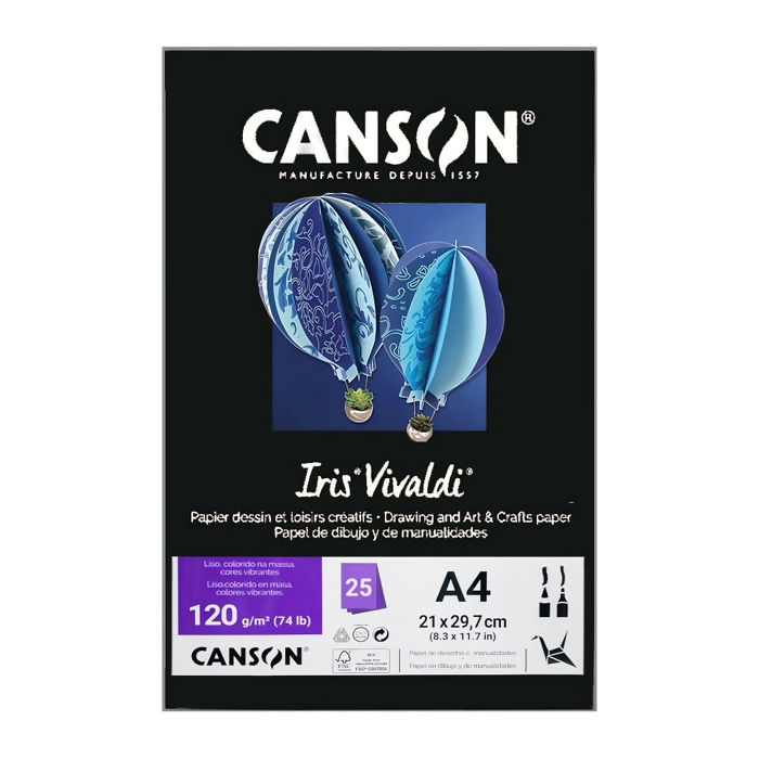 Canson® Iris® Vivaldi® é uma cartolina que oferece uma superfície lisa de alta qualidade em ambos os lados, com uma gama de cores tingida em massa, perfeito para Artes e Ofícios.