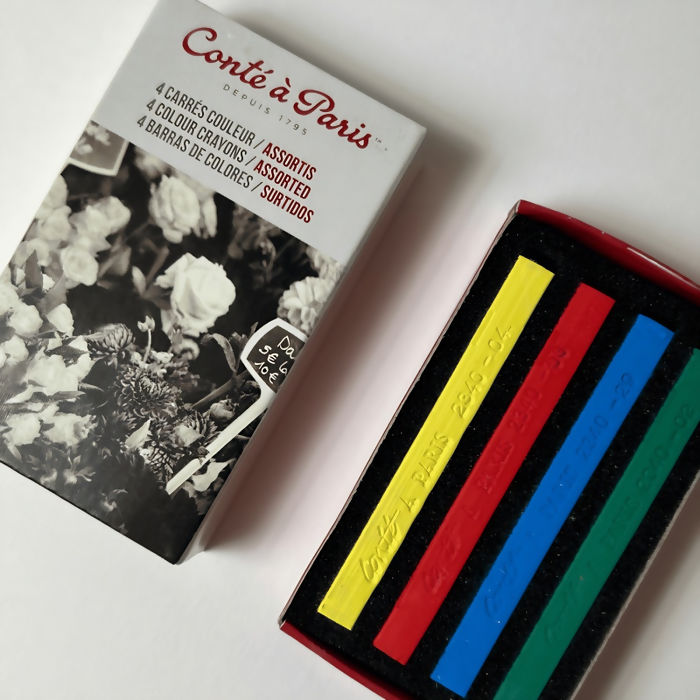 O pastel seco Conté à Paris é o crayon carré mais tradicional entre os artistas. Produzido com pigmentos de altíssima qualidade, o pastel seco Conté à Paris possui cores fortes e formato que possibilita ao artista riscos precisos e enérgicos. A maciez do pastel seco Conté é incomparável, porém é extremamente abrasivo ao contato com o papel apropriado para pastel.