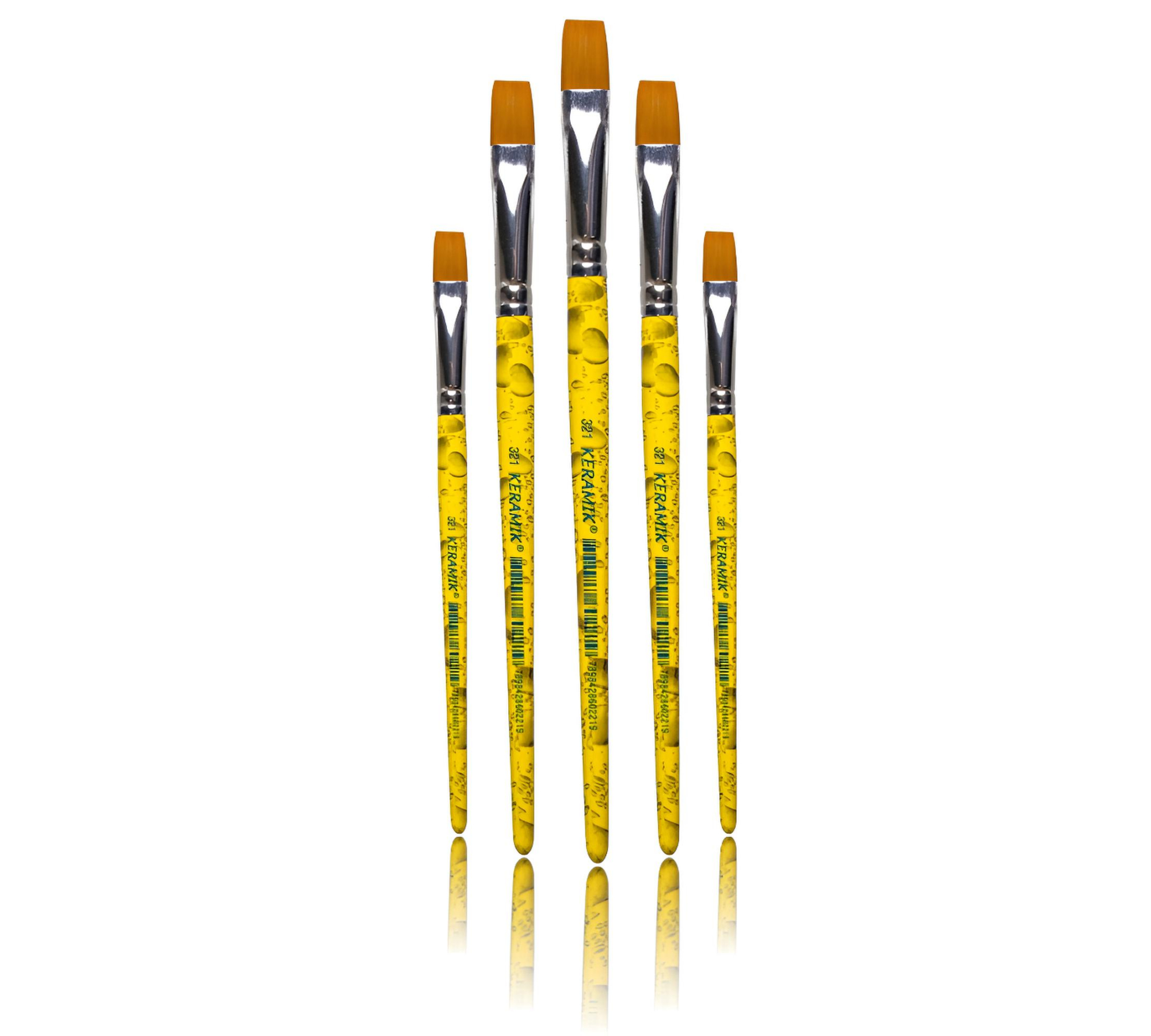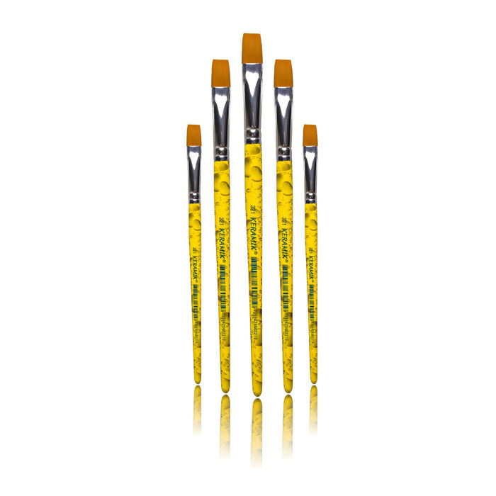 Pincel Keramik 321 Chato com cabo curto em madeira decorada e cerdas sintéticas douradas. Ideal para pinturas que exigem precisão em áreas maiores e traços definidos, como trabalhos decorativos, tecido, artesanato e técnicas com acrílica e aquarela.