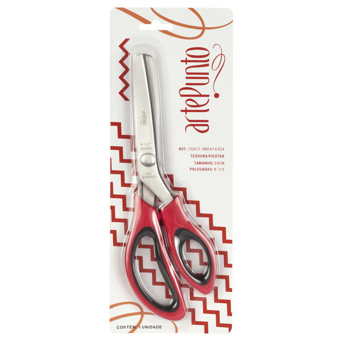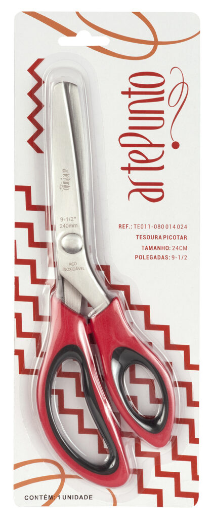 A Tesoura de Picotar TE011 ArtePunto é perfeita para quem busca praticidade e acabamento diferenciado em seus trabalhos. Com lâmina de aço inoxidável de alta durabilidade e cabo ergonômico em plástico resistente, garante cortes precisos em formato picotado, ideal para artesanato, costura, patchwork e trabalhos escolares.