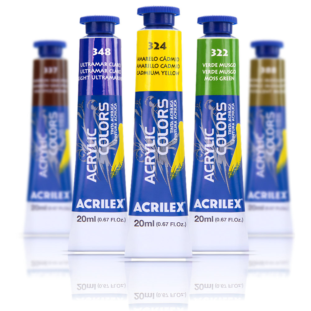 Tinta acrílica para telas e trabalhos artísticos em cartão, papelão ou outras superfícies preparadas com Base Acrílica para Artesanato, Gesso Acrílico ou Pasta para Modelagem Acrilex.