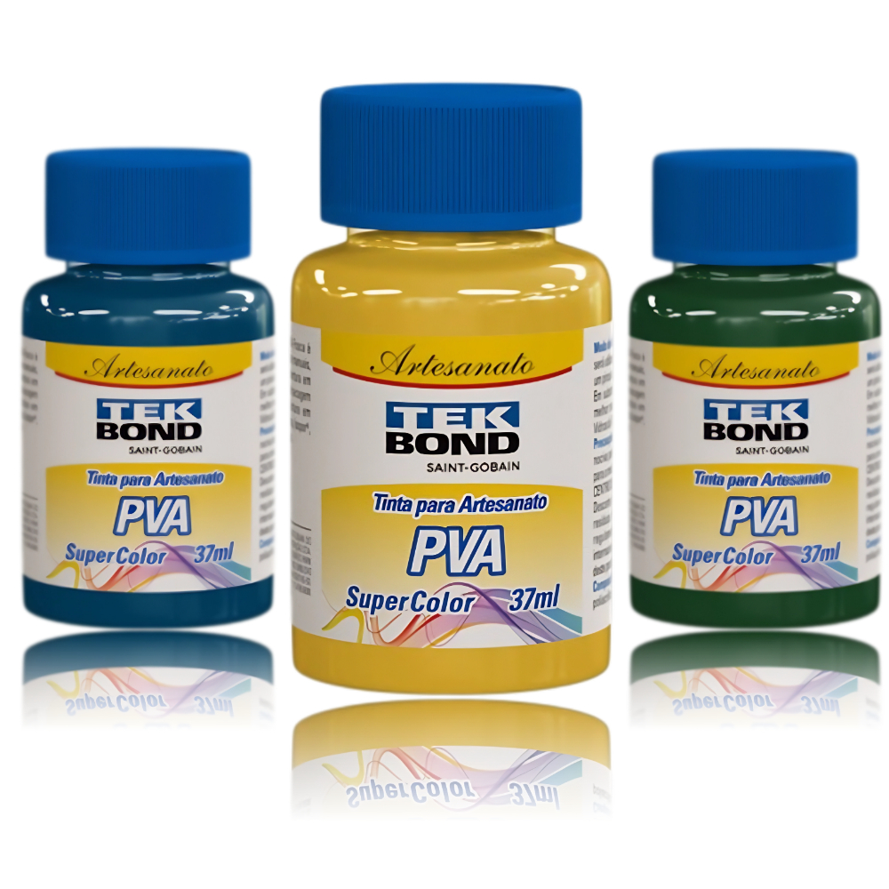As Tintas para Artesanato PVA Super Color da Tekbond são resultado de uma combinação de componentes e testes de última geração para oferecer o que existe de melhor qualidade em pinturas artísticas e artesanais. O resultado é um elegante e diferenciado aspecto fosco. Elas vêm prontas para o uso, secam rápido, são solúveis em água, os pingos indesejáveis são fáceis de limpar, possuem uma excelente cobertura e baixo odor.