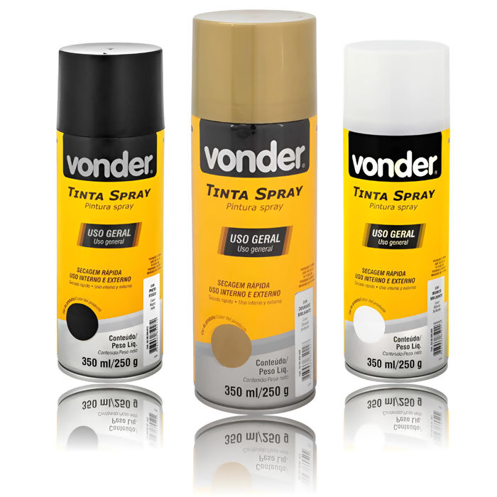 A Tinta Spray Uso Geral Vonder é ideal para pintura e acabamento em diversas superfícies, oferecendo praticidade, Ótima resistência às intempérie , secagem rápida e excelente cobertura. Sua fórmula proporciona acabamento uniforme e durável, sendo indicada para aplicações tanto em ambientes internos quanto externos.